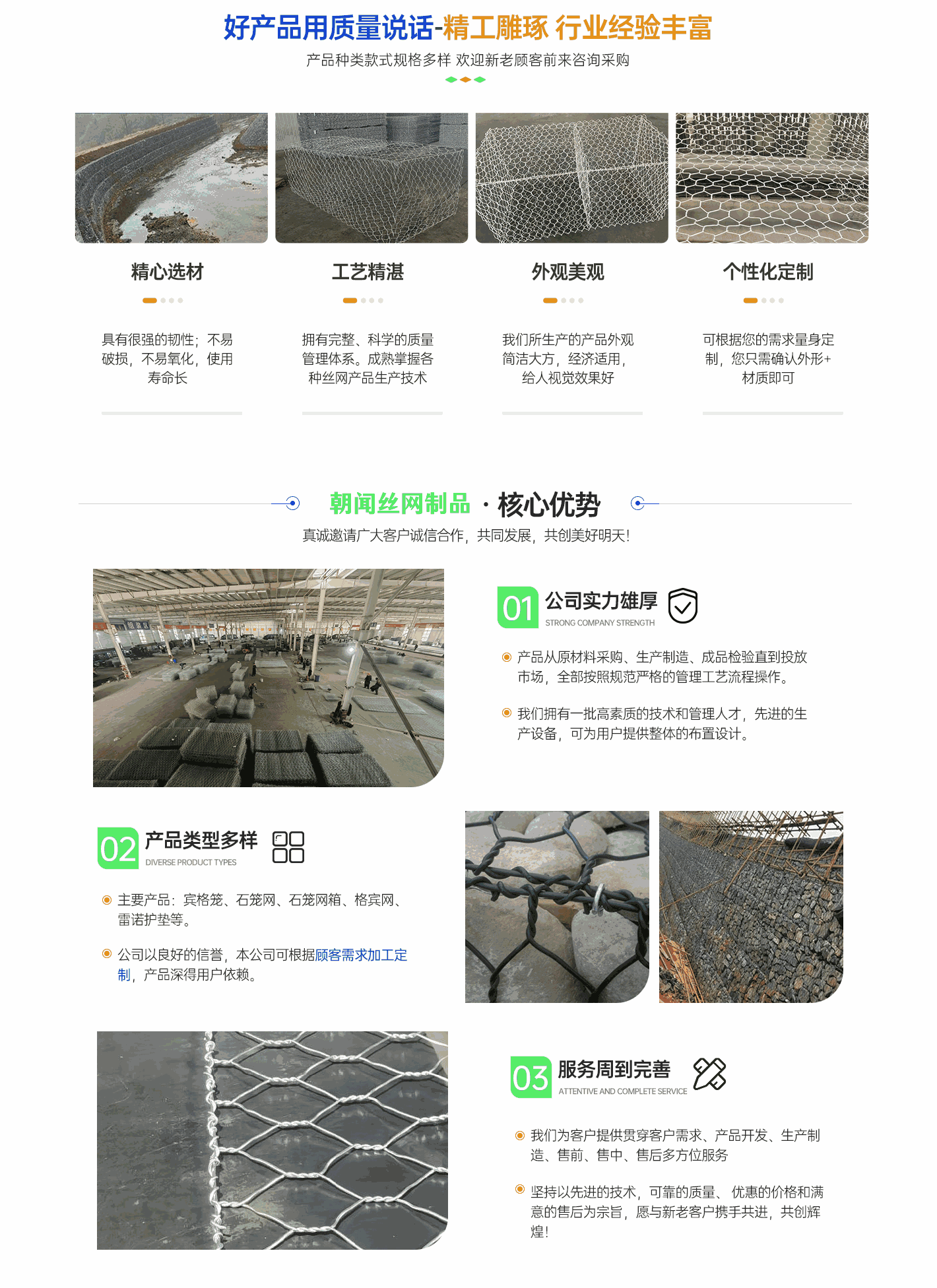 深州市朝聞絲網(wǎng)制品有限公司擁有“中國絲網(wǎng)之鄉(xiāng)”美譽(yù)的河北省致力于生產(chǎn)銷售格賓網(wǎng),雷諾護(hù)墊,景觀石籠網(wǎng),邊坡防護(hù)網(wǎng),綠濱墊,固濱籠的廠家,規(guī)格多種多樣。 我廠堅(jiān)持技術(shù)創(chuàng)新、科學(xué)管理、誠信經(jīng)營,注重引進(jìn)新型生產(chǎn)技術(shù)設(shè)備,推行標(biāo)準(zhǔn)化生產(chǎn),采用質(zhì)量管理體系,從原材料采購、生產(chǎn)管理、產(chǎn)品檢測等關(guān)鍵環(huán)節(jié)嚴(yán)格把關(guān),確保了產(chǎn)品質(zhì)量,贏得了客戶的信賴。我公司秉承“誠信、務(wù)實(shí)、高效”的企業(yè)宗旨,真誠希望與世界各地客戶互惠互利,共創(chuàng)美好未來!多年來"以誠立廠","以質(zhì)興業(yè)"。 憑借過硬的質(zhì)量、良好的信譽(yù)、優(yōu)質(zhì)的服務(wù)、合理的價格不斷拓展市場,誠摯的希望在平等互利,坦誠相待的基礎(chǔ)上與國內(nèi)外客戶長期合作!...